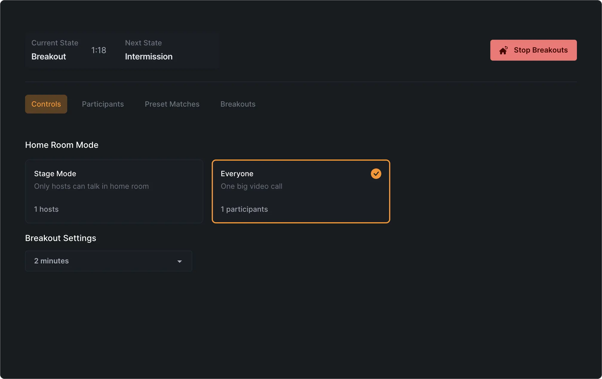 Easily switch into stage mode, track participants, manage security, influence matches between people you want to talk, and see in real time who is talking to who.